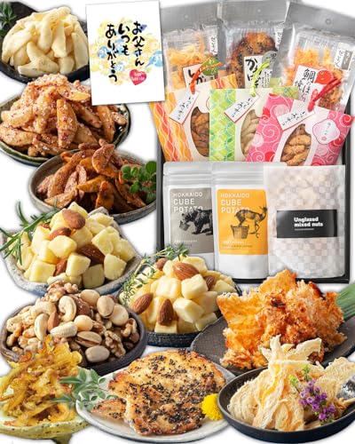 【賞味期限】おつまみ3種類 約1ヶ月(製造日より30日/パッケージに記載)。/柿の種3種類 約2ヶ月(パッケージに記載)。/北海道キューブポテト 約2ヶ月(パッケージに記載)。/ミックスナッツ 約2ヶ月(パッケージに記載)。【商品特徴】おつまみ乾きもの3種類。≪いかわさ(わさびくんさき) 内容量 17g。・黒ごまかわはぎ 内容量 18g。・鯛のほぐし焼き 内容量 16g。≫/柿の種3袋(梅ざらめ・きんぴらごぼう・じゃがバター)各1袋 25g。/北海道キューブポテト(リッチトリュフ・チーズ&ブラックペッパー)各1袋 38g。/ミックスナッツ 素焼き1袋。内容量 100g。/直射日光、高温多湿を避けて保存してください。【無料サービス】日頃の感謝を伝える「お父さんいつもありがとう」メッセージカードをお付けしています。【ギフト専門店の厳選おつまみ】いつもの晩酌を「ちょっと贅沢に」をコンセプトに、産地・鮮度・旬にこだわった乾きもの3種類、従来の柿の種より大きめで独特な三日月形をした、3種類のバラエティ豊かな3つの味の「柿の種」。北海道産のじゃがいもを100%使用したキューブ型フライドポテト2種類。素材の味を楽しめる香ばしい素焼き「ミックスナッツ」をセレクトしました。常温保存できて、食べきりサイズの小分けタイプだから、毎日の晩酌で選ぶ楽しみを与えてくれます。70代 80代 60代 50代 のお父さんも喜ぶプレゼントです。【ご注文時の留意事項】①[置き配]はショップ出荷では対応不可。(Amazon出荷では対応) ②ギフト配送は[□ギフトの設定]にチェックを入れて下さい。※未チェックだとご購入者様(送り主様)の氏名が一切記載されず。③賞味期限のある商品ですので、お召し上がり時期に合わせてのご注文や、注文後の配送予定情報(ショップ出荷の場合はショップからの連絡メール)を必ずご確認下さい。