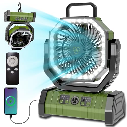 【20000mAh大容量の電池内蔵&4段階風量調節可能&高輝度LEDライト】キャンプ扇風機は20000mAhの超大容量のリチウムイオンポリマー電池を内蔵され、1回フル充電時で、最小モードで58時間連続使用が可能です。最大モードでも約15時間の連続使用が可能です。4段階風量調節可能、微風、弱風、中風、強風4つのモードがあり、お好みの風でリラックスできます。キャンプ扇風機は高輝度LEDライトも搭載し、低輝度で最大約138時間の点灯が可能です。ライトの輝度を3段階調節することができます。風量も輝度もお好みに合わせて調整できます。「使用時間は充電の状態と使い方によって異なる場合があります。」【左右45度/90度自動首振り&切タイマー機能】 弊店のキャンプ扇風機は左右自動首振り機能はもちろん、45°/90°2段階調節することもでき、広い範囲を涼しくしてくれます。手動で上下270°調節もでき、お好みの角度に送風ことができます。また、消し忘れ防止するため、切タイマー機能も搭載し、1時間、2時間、4時間、8時間が設定できます。就寝時、風邪をひくことを防ぎます。【吊り下げ・卓上・照明灯の3Way仕樣&usb充電式・コードレス扇風機】このキャンプ扇風機は室内用、車中泊,自宅、オフィスなどはもちろん、コンパクトでアウトドア扇風機に最適です。キャンプ、運動会、登山、遠足、ピクニック、釣りなどいろいろシーンに大活躍されます。吊り下げて使えるフックがあり、テントの天井に引っ掛けて下向きにも使用可能で、キャンプランプとして使用も問題ないです。素晴らしい熱中症対策の必需品です。また、 このキャンプ扇風機はType-C型充電ポートを搭載しており、20000mAh大容量なのでフル充電後でコードレス扇風機として使え、折り畳み取っ手付きで、小型&軽量でどこかで持ち運べます。【モバイルバッテリーとして使え&静音設計&リモコン付き】このキャンプ扇風機の本体にあるUSB-Aにケーブル繋げばスマホ等にも充電ができてモバイルバッテリーとして使え、キャンプで急な電池切れや台風の停電の際に役立つようになります。緊急停電時とキャンプ用品として最適です。リモコン付きで遠隔操作が可能でとても便利です。また回転音が気にならない静音設計はもちろん、スリープボタンが有りますので、夜のスリープ時インジケーター消灯も可能で生活の妨げになりません。卓上扇風機とキャンプ扇風機としても最適です。【1年間の安心保証&日本語取扱説明書付き&PSE認証済み】1年間の安心保証とアフターサービスをご用意しています。ご購入した日より、万が一初期不良がありましたら、アカウントサービス内の『アカウントサービス』→『注文履歴』→『販売元』→『質問する』から、弊店とお気軽にご連絡ください。