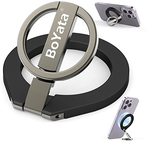 【磁力でピタっと貼りつく】BoYataマグネットリングは約1000gまでの荷重に耐える強力磁力を採用し、強力マグネット内蔵+Magsafeならではの吸着力でスマホリング落下の心配がありません。磁力リングは簡単に取り外せるので、すぐにMagSafe(マグセーフ)対応のワイヤレス充電や、気軽にスマホアクセサリーの付け替えなどを行うことができます。【金型改良】もっと楽しく利用することを目指して、BoYataはスマホリングを更に改良しました。 初代金型と比較して、新しい金型にはより強力な材料が使用されており、緩みにくいです。 回転軸がゆるくならないように強化され、耐久性が高くなります。軽量で便利、邪魔にならず、持ち運びにも便利です。高級感のあるスモーキーブラックのデザインで、どのスマホにも合わせやすい。【マグセーフ非対応でも使用可能】iPhone12/13/14シリーズはそのままスマホリングをお使いいただけます。メタルリングを利用で磁力がもっと強くなります。Samsung Galaxy、LG、 Sony Xperia、 HUAWEI、 XiaomiなどのAndroidスマホの場合は、付属の磁気増強メタルリングを貼り付けたら、MagSafeリングを使用することもできます。メタルリング貼る時間が長いほど粘着性が高くなるため、24時間後ご使用ください。【スマホリング&スマホスタンド両用】混雑したバスや電車の中でリングに指を通して片手で簡単にスマホを持つことが可能、スマホをより使いやすくなり、思わぬ落下を防ぎます。手持ちだけでなく、縦横どちら向きの卓上スタンドとしても自由にアレンジして利用できます。映画鑑賞やビデオ通話、自撮り、作業中に最適な角度を確保できます。【マグネット式で跡を残す心配なし】スマホリングはマグネットタイプなので取り外しが簡単、テープ跡や糊残りを気にせずお使いのiPhoneをきれいな状態でご利用いただけます。しかしながら、付属のメタルリングはテープ式で、テープ跡を気になるの場合はスマホ本体のかわりに、スマホケースに貼り付けください。