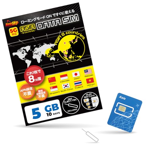 【5G回線対応!複雑な設定は不要!日本を含むアジア8ヵ国でシームレスに使える!】NewSky ASIA8 DATA SIM【5GB/10日間が激安!