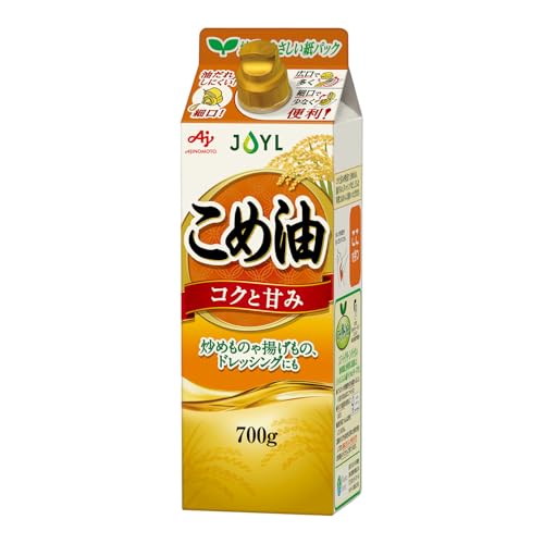 【商品説明】「JOYL ( Jオイル ) 味の素 こめ油」は、日本の米食文化から生まれた、サラダオイルに比べ、コクと甘みが特長のおいしい油です。【品質】1.油だれしにくく注ぐ量を選べるW構造のキャップ。2.容器は酵素バリア性・遮光性に優れた素材のため、開封前賞味期限2年で従来のペットに比べて2倍長持ち。3.容器をペットから紙パックにすることで、プラスチック使用量約60%削減・CO2排出量約34%削減※(当社600gPET比)※容器の製造から廃棄に至る過程における二酸化炭素の排出量【使用方法】炊飯、炒めもの、揚げものの加熱料理や、ドレッシングに。【原材料】食用こめ油(国内製造)【内容量】700g【商品サイズ(高さx幅x奥行)】215x70x70(mm) 【栄養成分】大さじ1杯(14g)当たり エネルギー:126kcal、たんぱく質:0g、脂質:14g、炭水化物:0g、食塩相当量:0g【注意事項】紙パック容器は外部からの衝撃に弱いため、取扱いに注意してください。開封後は、なるべく早め(1~2ヶ月)にお召し上がりください。開封後は横倒しで保存すると漏れるおそれがありますので、キャップをしっかり閉めて、立てて保存してください。低温で白濁したり、固まったり沈殿が生じることがあります。こめ油の成分ですので温めると元に戻ります。品質に変わりありません。油は流しに捨てないでください。
