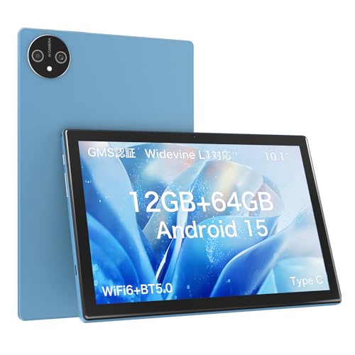 【Android 15搭載10.1インチタブレットが初登場】最新のAndroid 15システムを搭載し、アプリのスムーズな起動とマルチタスクを実現。12GB RAM(仮想拡張技術採用) と 64GB ROM を備え、複数アプリの同時利用も快適。さらに microSDカードで最大128GBまで拡張可能 なので、動画や写真もたっぷり保存できます。アプリの切り替えはもちろん、重いゲームや動画編集もストレスフリー。画面をスワイプするたびに、なめらかな反応が指先に伝わり、操作の快適さを実感できます。【【高性能A523 CPU & Widevine】L1認証でNetflix/Prime VideoをHD視聴】8コアARM Cortex-A55プロセッサ(2.0GHz)で、動画編集やゲームも快動作。前世代比で電力効率30%向上し、バッテリー持続時間とパフォーマンスを両立。10.1インチIPSディスプレイは、鮮やかな色彩と広い視野角を誇り、斜めから見ても色褪せないクリアな画像を表示。朝のベッドでの動画視聴や、作業時にも、くっきりとした文字と自然な発色が目に優しく、長時間見ても疲れにくい設計です。【6000mAh大容量バッテリー搭載、外出でも心配無用&2.4GHと5GHzのWI-FI+Bluetooth 5.0】朝の通勤中に動画を視聴し、昼休みにゲームを楽しんでも、夕方まで余裕のバッテリー残量。Type-C急速充電を利用すれば、30分ほど充電するだけで、さらに数時間の使用が可能。バッテリーアイコンが減っていくのを見る心配から解放されます。さらに、2.4GHz帯 遠距離でも安定した接続を実現(家中どこでも繋がる)。5GHz帯 高速通信で動画の途切れやラグを軽減(オンライン会議やゲームに最適)。Bluetooth 5.0 ワイヤレスイヤホンやキーボードと接続しても音飛びなし。これで、自宅でも外出先でも、快適な通信環境が手に入ります!【臨場感あふれるデュアルスピーカ & 高耐久・高級感のある金属ボディ】 左右に配置された2つの高音質スピーカーが、豊かな立体音響を実現。NetflixやYouTubeの映画鑑賞では、まるで劇場にいるような深みのあるサウンドを再現。音楽再生時にもクリアな高音と力強い低音が広がり、耳に心地よい没入感を提供します。競合製品と異なり、アルミニウム合金フレームを採用。軽量(500g)ながらもしっかりとした質感で、手に取るときの冷たい感触が高級感を演出。表面の微細なブラシ加工が指紋や傷を目立ちにくくし、ビジネスシーンでも洗練された印象を与えます。16×24.2×9cm軽量設計で長時間持っても疲れず、スリムなボディがバッグの中でもかさばりません。【【画面分割+無線投影&】児童守護+電気用品安全法(PSE)認証済み】 在宅ワークで資料確認しながらメール処理したい方に最適な画面分割機能で、Web検索とメモ書きを同時にこなせ、カフェでのんびり動画を楽しみながらSNSチェックする時も快適。会議での資料共有もMiracast対応の無線投影でスマートに解決。子育て中のご家庭には、Google公式認証(GMS)で安心アプリ利用可能な上、児童守護モードが使用時間制限や有害サイトブロックでお子様の学習を安全サポート。電気用品安全法(PSE認証済み)で充電時の過熱防止対策も万全なため、ご家族皆様で長く安心してお使いいただけます。️【付属品】タブレット本体 ×1,ACアダプター ×1,データケーブル ×1,HD保護フィルム ×1,クリーニングクロス ×1,タッチペン ×1,取