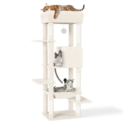 [CozyMeow] キャットタワー スリム 据え置き ハンモック キャットハウス 大型猫用 つめとぎ 猫 キャットウォーク 爪とぎ 多頭飼い 人気 猫タワー キャットステップ おしゃれ かわいい ねこ キャット タワー 高い安定性 運動不足解消 高さ約150cm 日本語説明書付き (ベージュ, 1が激安!