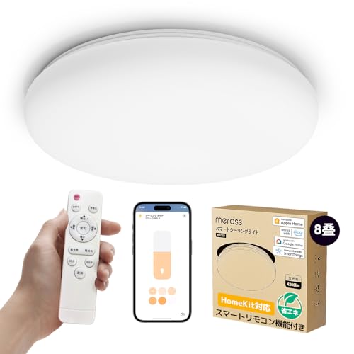 【HomeKit対応のシーリングライト】Siriで自由自在に扱えるLEDシーリングライト。アプリをダウンロードしなくても、HomeKit でスマート シーリング ライトを簡単にペアリングして操作できます。Homekit対応なので、お手持ちのiphoneが簡単ステップでライトのリモコンに早変わります。アプリをダウンロードする必要はなく、iPhoneに接続するだけで、プルダウンメニューでライトを制御できます。より便利になり、プライバシーをよりよく保護できます。【音声コントロール&リモコン付き】Siri、Amazon Alexa、Google Assistantに対応し、音声でスマートシーリングライトをコントロールします。また、お年寄りやお子様に便利なリモコンを付き、あらゆる角度や方向から光の明るさや色温度をコントロールできることです。アプリ、リモコンや音声様々な制御方法を自由に選択できます。(ご注意:リモコンのオン/オフボタンを7秒間長押ししてリセットできます。)【遠隔操作&ローカルコントロール】自宅のデバイスは電源が中断されず、インターネットに切られなく、インターネットに接続できる場所であれば、どこでもmerossアプリでシーリングライトを操作することができます。 スマホとスマートシーリングライトが同じネットワーク内にある場合、meross アプリはローカル コントロール機能を開始し、コントロール プロセス全体が迅速かつスムーズで、遅延感がありません。【アプリ制御&無段階調光&調色调光】スマートシーリングライトは暖かい黄色、昼白色、冷たい白という三種類色があり、また、暖かい黄色2700Kから冷たい白7000Kまで自由調整出来、merossアプリで好みに合わせて照明の雰囲気を選びます。merossスマートシーリングライトは高品質なLEDチップを採用し、4200lmの明るさは隅々まで均一に配置しており、照明効果が均一、より明るいです。演色性はすべてRa85以上を実現します。自然の太陽光に近い波長を実現し、目に負担をかけない高演色性、部屋全体を美しく照らすことができます。0~100%の範囲で明るさを無段階に調整可能ます。【タイマー機能&スケジュール設定】タイマー機能で30分/60分に設定可能、スイッチを切り忘れたり、ライトをつけたまま寝てしまう人に最適、節電に設定可能ます。スケジュールに基づいて照明をオン/オフする時間を設定することもできます。例: 夜間は18:00に照明が自動的に点灯し、23:00に照明が自動的に消灯します。仕事と休憩をより規則的にし、夜更かしを減らします。また、長期間の旅行中に定時に照明をオンにすれば誰かが家にいるように装うことができ、防犯にも役立ちます。【常夜灯モード&お好みボタン】低輝度の常夜灯モード、グレアなし、眠っている子供、夜の授乳、高齢者ケアに適しています。お好みボタン付き、リモコンの【お好み】ボタンを3秒以上長押しすると、よく使う色合いと明るさをお好みとして登録しておくと、次回はボタン一つで簡単に呼び出すことができます。【薄いデザイン&密閉性が優れる&工事不要】LED側発光技術と優れる透明性でもっと薄いデザインを実現し、お部屋の圧迫感を少なく、お部屋の広さを感じられます。安全性が高く、人体への害もなく、密閉性、防蚊性に優れています。PC耐火材料を使用し、ランプを交換する必要のな、V0耐火グレード、爆発や感電が防がれます。また、merossスマートシーリングランプは軽くて持ち運びが簡単で、取り付けるのも簡単で、女性でも簡単