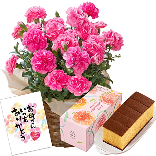 【※重要※(お届けについて)】①5/7~12のいずれかのお日にちにお届けいたします。日時指定はできません。 ②「北海道・沖縄県 全域。 東京都 伊豆諸島、小笠原諸島。 鹿児島県 大島郡喜界町、大島郡与論町、十島村、三島村、鹿児島郡 」宛のお届けはできません。 ③amazonシステム表記や、メール・注文履歴等に記載のお届け日と異なる場合があります。 予めご了承の上、ご注文ください。【賞味期限】幸せの黄色いカステラ 発送より約2週間(パッケージに記載)。【商品特徴】カーネーション鉢植え 4号鉢(ピンク)/ 幸せの黄色いカステラ1本(5切れカット済み)/1本の外寸 約15.0x6.7x6.5cm/1本の内容量 155g/防腐剤不使用で安心してお召し上がりいただけます。【無料サービス】日頃の感謝を伝える「お母さんいつもありがとう」メッセージカードをお付けしています。【【母の日ギフト】花とスイーツのセット】本場の長崎カステラと、届いてすぐに飾っていただける、母の日定番のカーネーション鉢植えセットです。鉢カバーと育て方のしおり付きで専用配送BOXに梱包し、大切にお届けいたします。※生花のため、育成状況などにより写真のイメージと異なる状態で届く場合がございます。ご了承ください。【幸せの黄色いカステラ】熟練職人によって焼き上げられた、長崎カステラ。新鮮な卵と天然蜂蜜が生み出す、しっとりふわふわの食感と豊かな風味が特徴です。ピンク色をベースに、カーネーションの花があしらわれた母の日専用パッケージ。「お母さんありがとう」と気持ち伝わるメッセージ入り。【ご注文時の留意事項】①[置き配]はショップ出荷では対応不可。(Amazon出荷では対応) ②ギフト配送は[□ギフトの設定]にチェックを入れて下さい。※未チェックだとご購入者様(送り主様)の氏名が一切記載されません。③賞味期限のある商品ですので、お召し上がり時期に合わせてのご注文や、注文後の配送予定情報(ショップ出荷の場合はショップからの連絡メール)を必ずご確認下さい。【幸せの黄色いカステラ・原材料】 鶏卵(国産)、砂糖、小麦粉、水飴、ザラメ糖、蜂蜜、(一部に卵・小麦を含む)。
