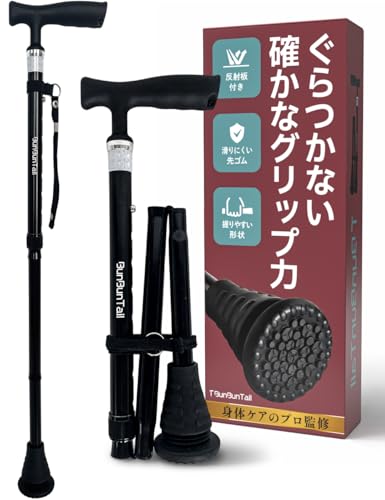 雑誌『クロワッサン』介護特集掲載 杖 一本杖 ステッキ 折りたたみ 軽量 400g 伸縮 8段 72–90cm 男女兼用 介護 高齢者 歩行補助 滑りにくい先ゴム 反射材 ギフト BunBunTail ロイヤルブラックが激安!