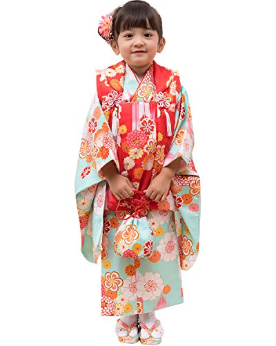 3歳の女の子への七五三祝いに。一生の思い出を彩るかわいいデザインの着物セットを揃えました。巾着や髪飾りなどの小物までセットになっているので、届いてすぐに着られます。【[セット内容]】被布/着物/伊達衿/長襦袢/髪飾り/巾着/草履/腰紐/足袋/専用化粧箱【[サイズ]:着物身丈】76cm(腰上げ前 90cm)、着物袖丈:57cm、着物裄丈:42cm(肩上げ前 47cm)、被布コート:48cm、草履:18cm、足袋:15-16cm※小物含め全てサイズ固定(ワンサイズ)となっております。 商品のサイズ変更などは行っておりません。肩上げ・腰上げ済みです。身長90cm~100cmくらいのお子様であればお直しなしで着ていただけます。【[品質と素材]】ポリエステル100% [生産国]:中国