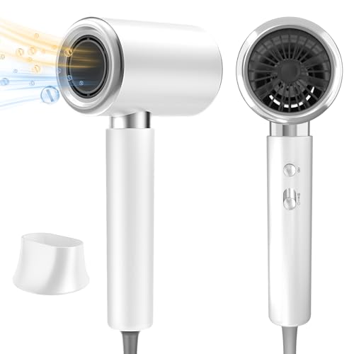 【大風量でスタイリッシュなドライヤー】1200Wハイパワーからの大風量は短時間で髪を速く乾かせるため、しっとり保湿しながら頭皮や毛髪のダメージを軽減してくれます。13.8m/s の大風量!驚きの強風で速乾を実現。毎朝、髪を洗っても、さっとスタイリングして、すっきりした気持ちで出かけられます。髪に届く風は60℃以下でも素早く乾かしてダメージから解放する。ハンドル持ちやすく、手触りが良い、軽量・コンパクトでスタイリング時のストレスが軽減、心地よいにご使用いただけます!️【57℃恒温機能&高濃度マイナスイオン】より高速でハイパワーが採用され、僅か数分間以内で、根元から髪を素早く乾燥させることができます。本製品はスマート恒温制御センサーが搭載され、髪へのダメージをしっかり防ぎながら、57℃を超えると電源が自動的にオフになり、ご家族で安全・安心にご使用頂けます。2000万個のマイナスイオンがあるため、髪の水分を保ちながら潤す。静電気を抑制し、パサつき、枝毛、広がりや切れ毛などの問題も改善されます。水分を与え、しっとりとしたまとまりやすい髪へ。⚜️【3つ運転モード&NTC過熱防止機能で安心】ワンボタンでHOT/COLDを自在に切り替え可能。お好みに合わせて切り替えることができる大風量ヘアドライヤーです。3段階風量調節、温風・冷風や強弱の切り替え、髪の仕上げにまとまりやすいです。髪を均一な適温に維持して、過度に乾燥させない。過熱による髪と頭皮へのダメージを防止できます。温風であたためながら髪のくせをのばし、冷風で冷やすことでしっかりくせのびをキープします。大風量がある一方、電気の消費量が低くて、電気代が節約できます。過熱防止装置が搭載され、危険な温度を感知したら、自動的に電源が切れる安全保護機能です。【軽いから楽に乾かせる&マグネット式ノズル】“使いやすさ”にこだわったシンプル設計です。この小型ドライヤーは圧倒的なコンパクトサイズで軽くて使いやすい、重さはわずか460gです。長時間の使用でも腕が疲れにくい軽量ドライヤーです。ノズルは吸着した状態で360°回転可能です。利き手や髪を乾かす持ち手など体勢に合わせて調節できます。マグネット式のノズルは、取り付け・取り外しがワンタッチ。吹出口が狭く、風圧を増してスタイリングしやすくなります。【様々な場合で大活躍&プレゼントにも最適】家庭用だけではなく、業務用ドライヤーとして、負けない大風量と耐久性が持つことで、美容師にも大人気です。かさばりにくく場所をとらないほか、軽量でコンパクトに収納と携帯に便利です。スポーツで、お仕事で、ご旅行/出張で持ち運びにも便利です。クリスマス、誕生日、記念日のプレゼントにも最適です。【製品仕様】本体サイズ 約W12.4×D7.5×H29cm / カラー ホワイト / 材質 PC / 風速 約13.8m /s (MAX) / 消費電力 1200W (MAX) / 重量 約460g / ケーブル長さ 約1.9m。