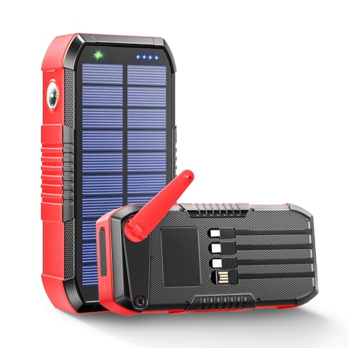 【22.5W/PD18W急速充電 超大容量バッテリー】太陽光をソーラーパネルに当てることで本体に蓄電可能なソーラー充電器です。iOS、Androidシステム両方と互換性のあるPD18W急速充電をサポート、充電速度は従来の2.5倍速、よりスピーディーな充電が実現され、充電時間を大幅に短縮。63200mAh超大容量により、スマホやタブレットはもちろん、携帯扇風機、ゲーム機などUSB機種へ複数回も充電でき、アウトドア活動や長期間の外出もバッテリー切れの心配はなく、停電時、災害時など電源が取れない状況に大変重宝されます。【【内蔵ケーブル+出力ポート】6台同時充電】Type-C/microUSB/アイフォン用の3規格出力ケーブル、iOSとAndroidスマホ両方対応、余計にケーブルを持ち運ぶ必要がなく、接続したデバイスに応じた最適な電流で充電できます。さらに、USB-Aポート2個付き、Type-C入出力兼用ポートに加え、最大6台同時充電が可能。スマホをモバイルバッテリーに接続し、電源ボタンを押すと充電開始、外出先で複数のデバイスの充電が必要な時でもこの一台で同時にまかなえます。(※複数台同時充電の場合、急速充電規格が適用されない場合があります。)【USB入力+ソーラー蓄電+手回し充電 5WAY蓄電】アウトドアにぴったりな太陽光蓄電ができるほか、内蔵USB-Aケーブル、microUSBポート、Type-C入出力ポートからでも充電器本体へ充電できます。さらに、手回し充電も対応可能で、ハンドルを回して発電し、スマホなどのデバイスを充電できる手回し充電器として、災害時やアウトドアシーンに使えます。4つのLED残量ランプにより、バッテリー残量と蓄電状況が確認できます。(※ソーラー充電と手回し充電では、満タンになるまでかなり時間がかかるため、普段なら、USBから充電することをおすすめさせていただきます。)【【LEDライト*コンパス付き】防水/防塵/耐衝撃】高輝度LEDライト2個付き、点灯モードとフラッシュモードを切り替えられ、夜道や停電時、緊急時で懐中電灯代わりに活用できます。簡易なコンパスを備え、アウトドアに最適な多機能充電器です。IP67防水防塵レベルがあり、高強度ABS+PC材質を採用し、落下に強く、全体的に頑丈でゴツイ作りになっていて、過酷な環境でも蓄えた電力を守り抜き、悪天候でも耐えられるタフなソーラーチャージャーで、アウトドア用、防災用アイテムとして1台備えてあれば心強いです。【【安全保護機能付き】PSE認証済】高性能ICチップに充実な安全機能を搭載、過充電保護/過放電保護/過熱防止/ショート時に自動停止などの保護機能で充電器を安全に稼動させます。PSEマーク取得済、安心*安全にご使用いただけます。【パッケージ内容】ソーラーモバイルバッテリー本体、充電コード、収納袋、取扱説明書(保証書付)。【一年安心保証付き】正しい使用方法において、万が一商品に不具合がある場合は、商品ページの販売元をクリックして、「質問する」ボタンより弊社までご連絡いただければ迅速に対応いたします。