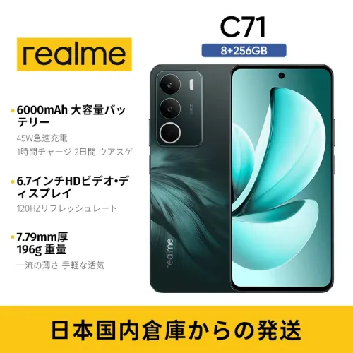 realme C71は、日々の生活を豊かにする高性能スマートフォンです。大容量バッテリーと急速充電機能で、長時間の使用を可能にし、忙しいあなたの毎日を力強くサポートします。美しいディスプレイと高精細カメラを搭載し、あらゆる瞬間を鮮やかに切り取ります。